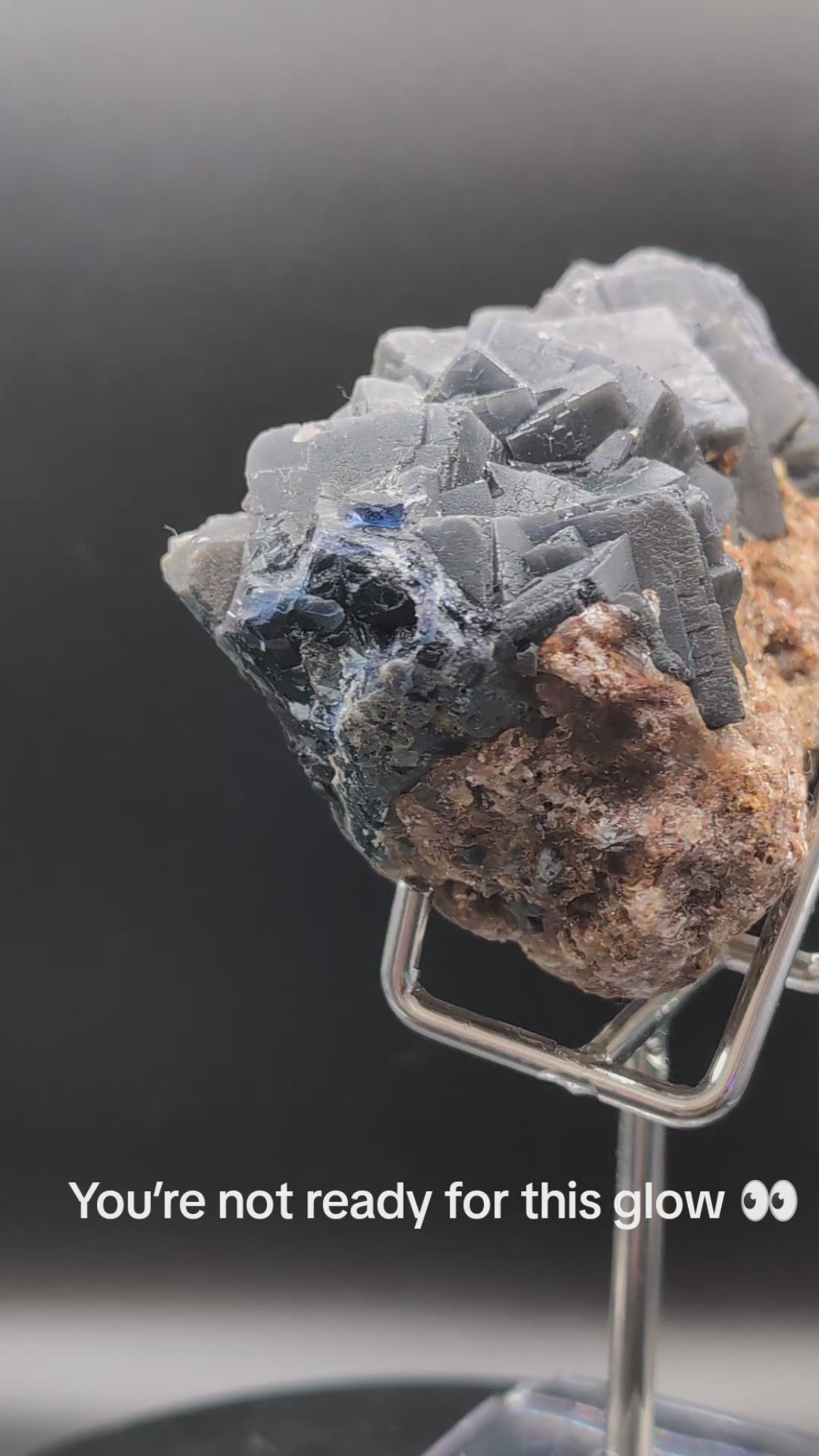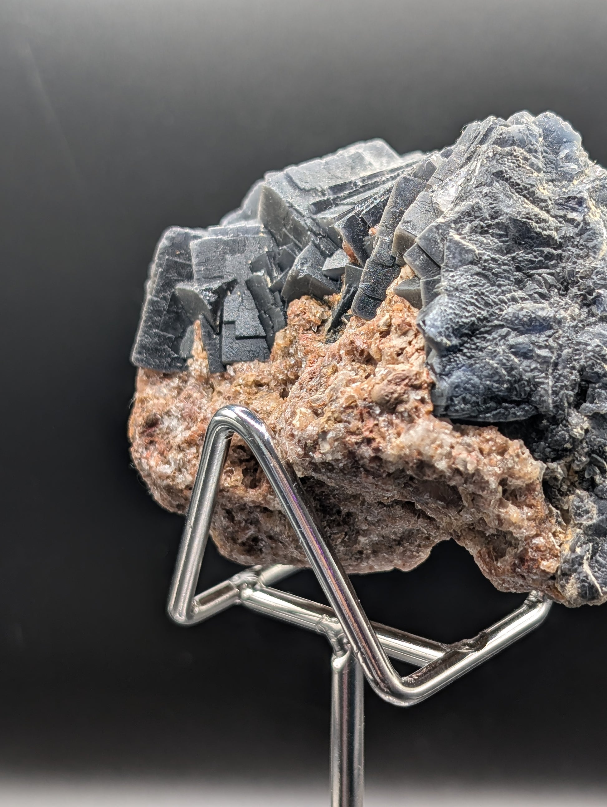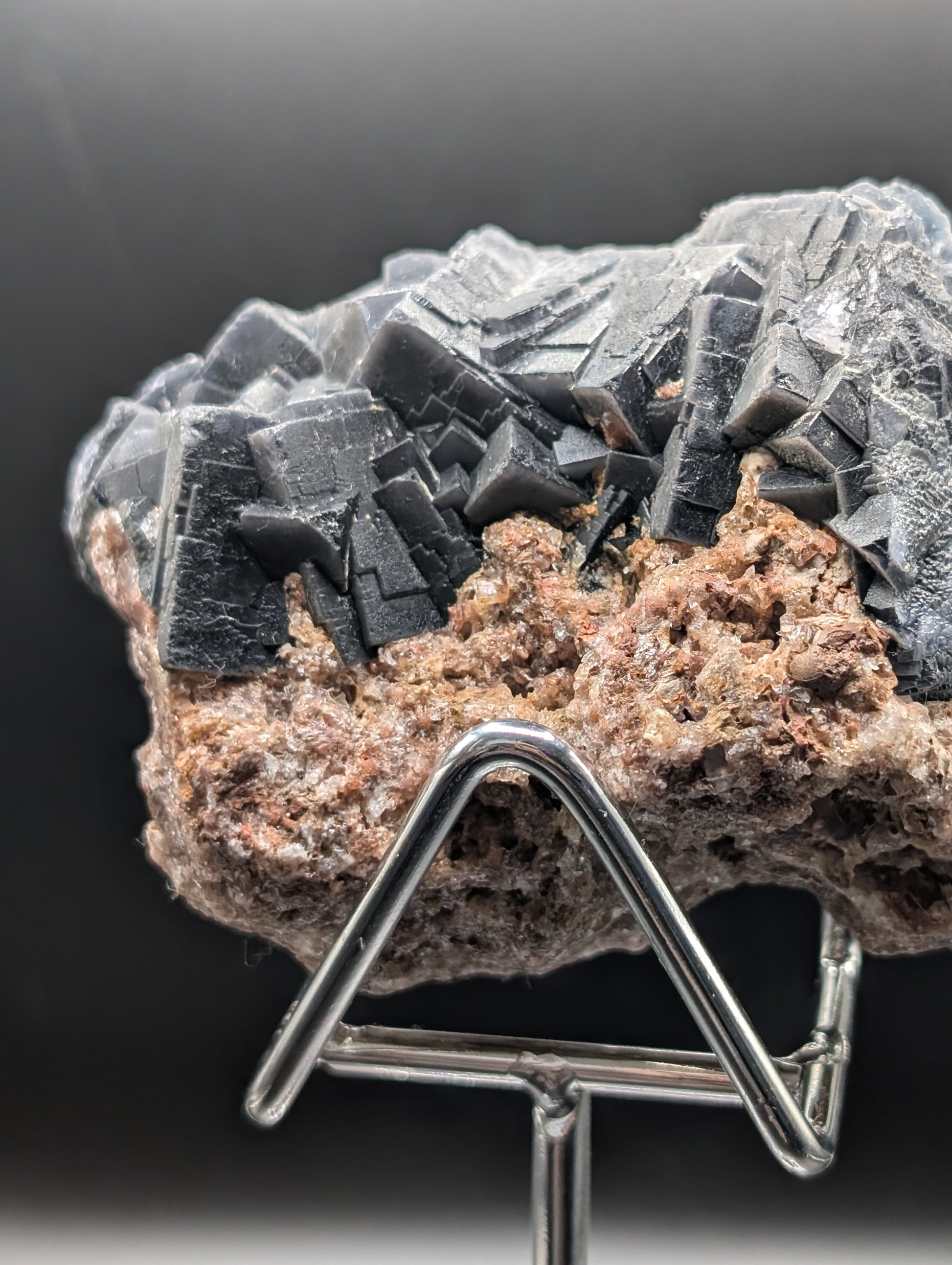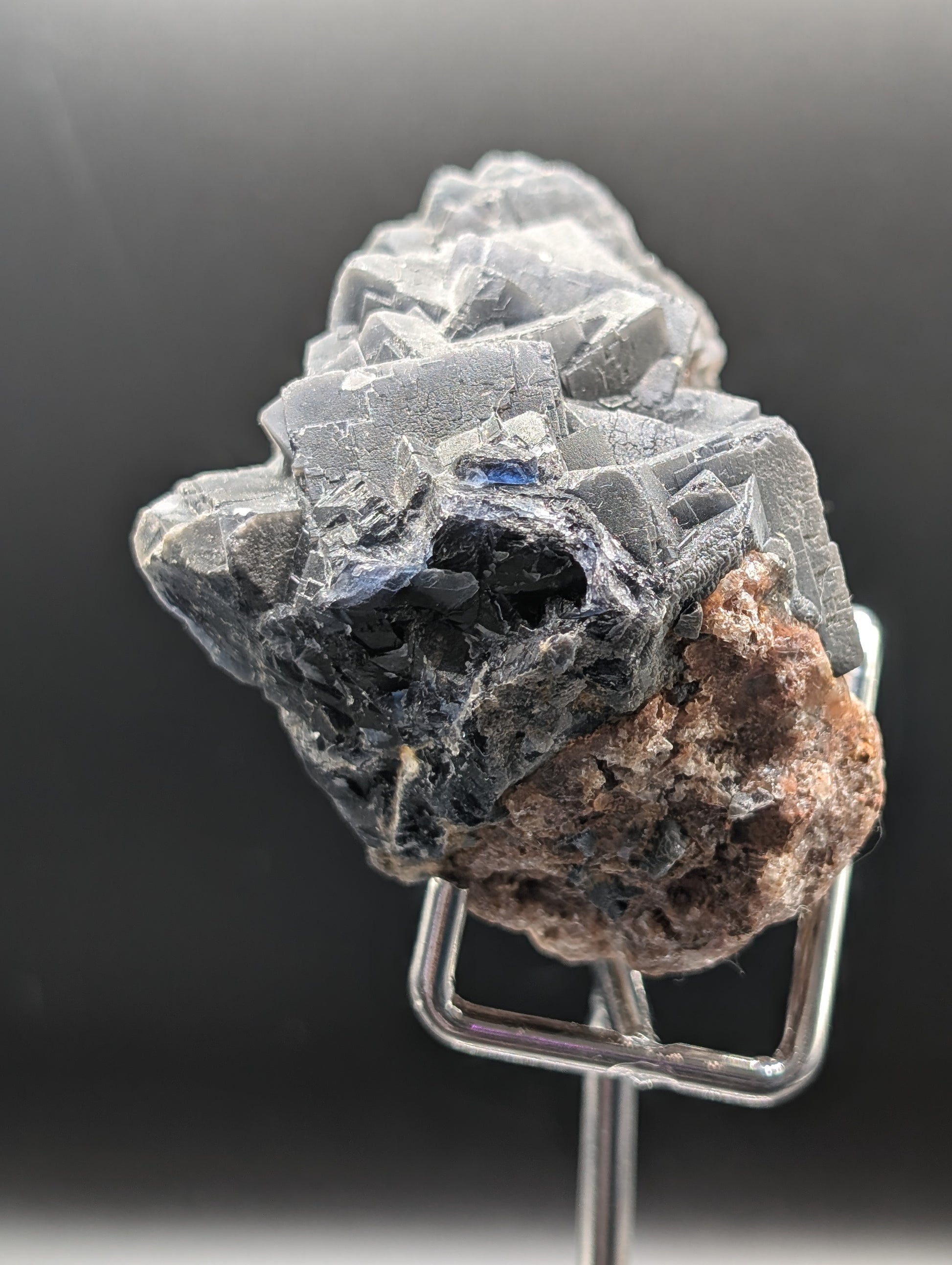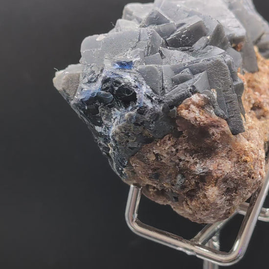In normal lighting, the fluorite appears deep grey to almost black, with crisp geometric cubic growth contrasting beautifully against the natural earthy matrix.