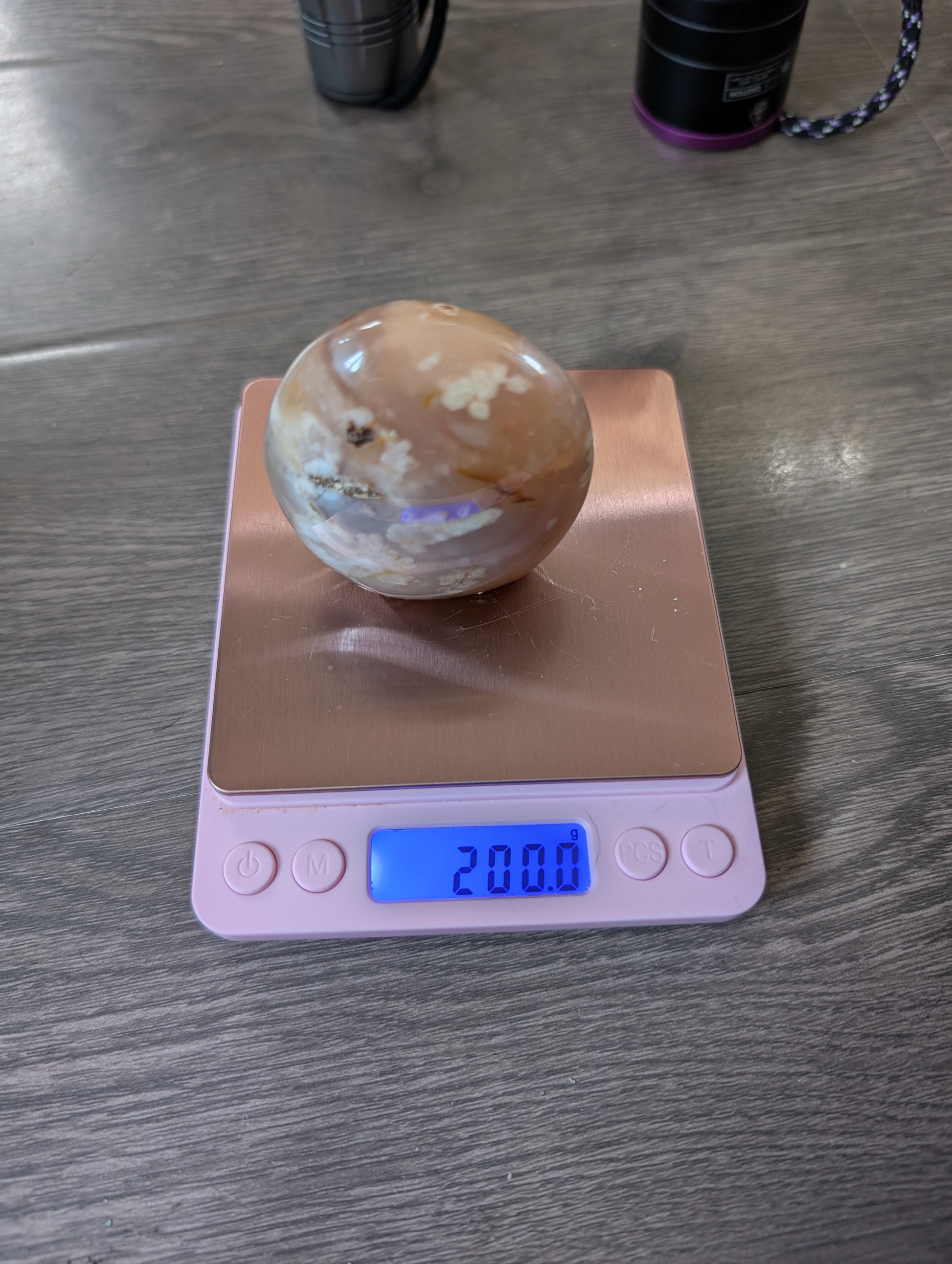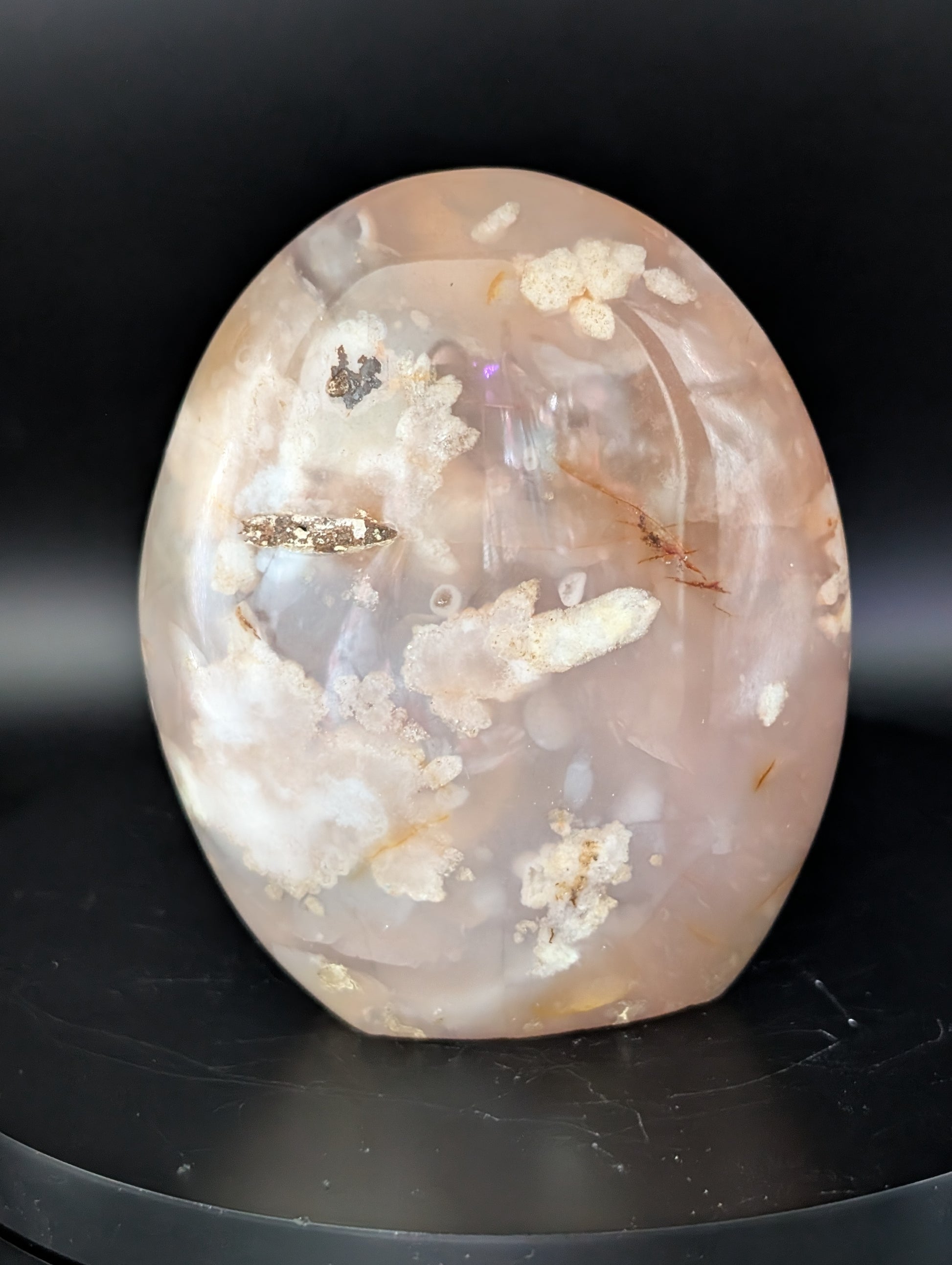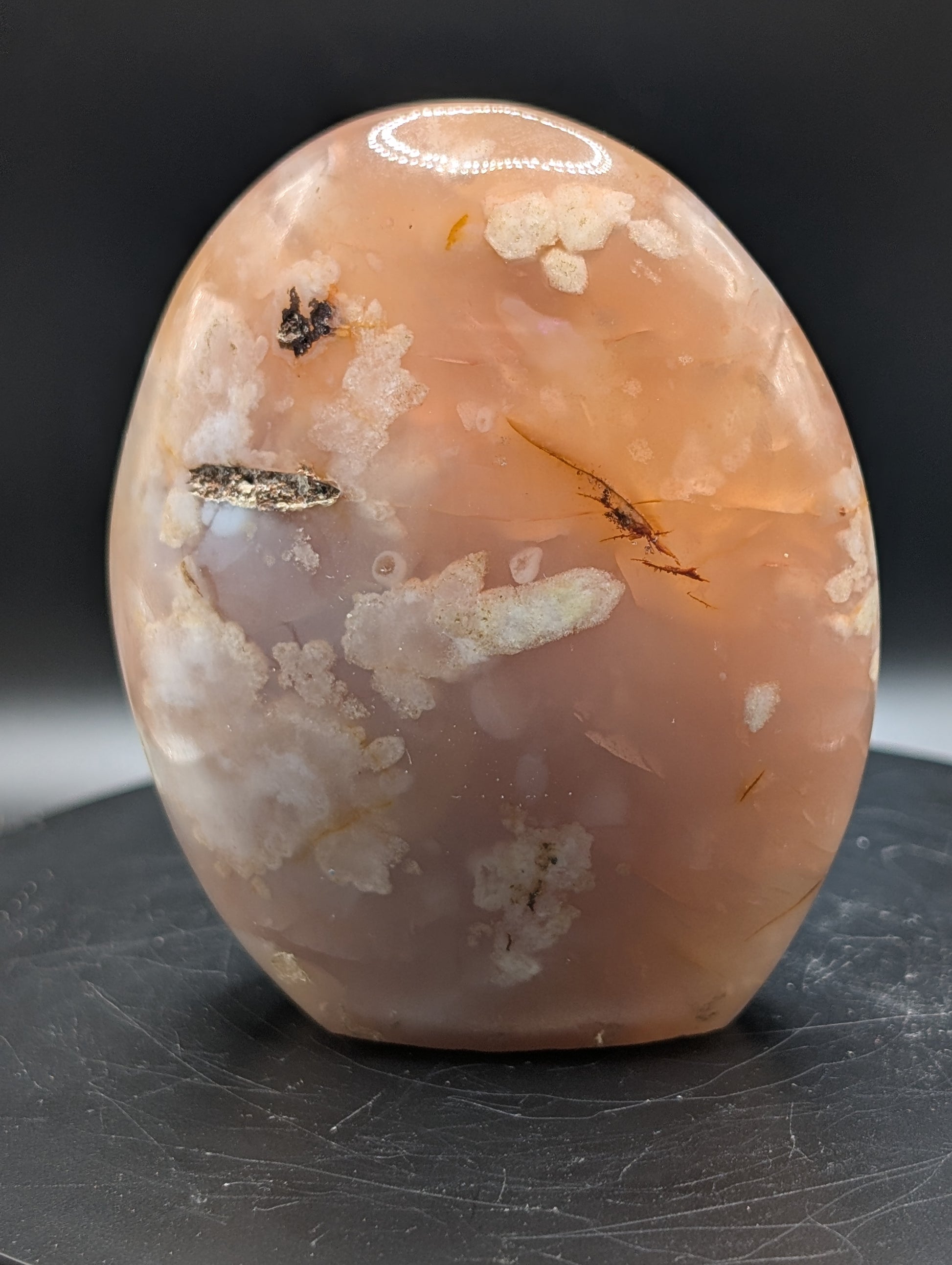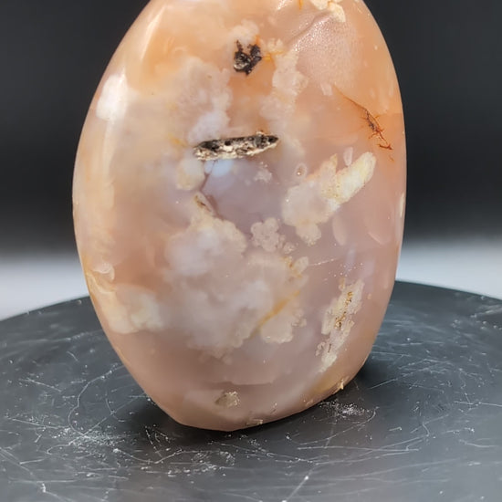 A beautiful flower agate freeform featuring soft peach tones, delicate white “blossom” inclusions, and a gentle natural translucency.
