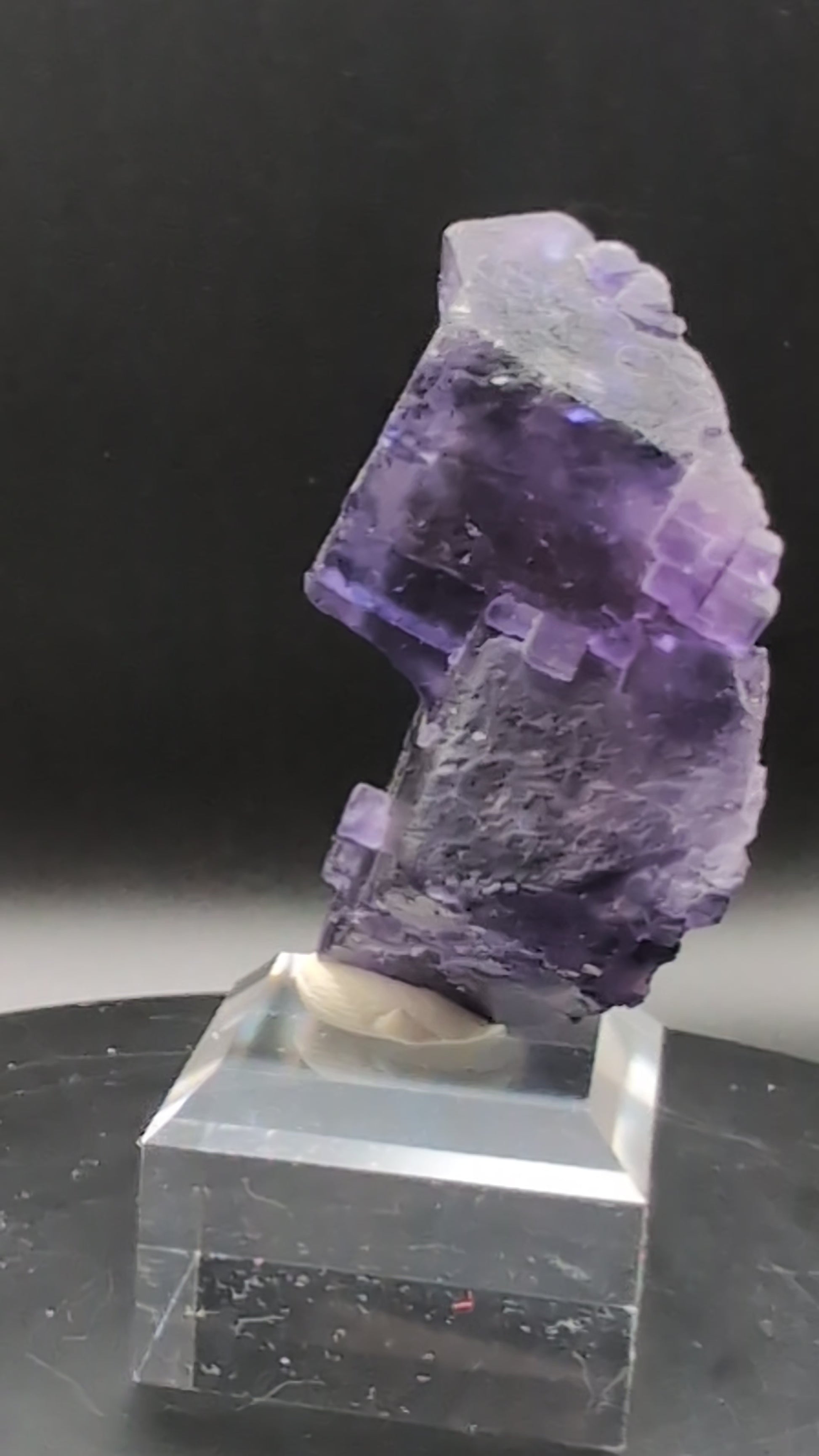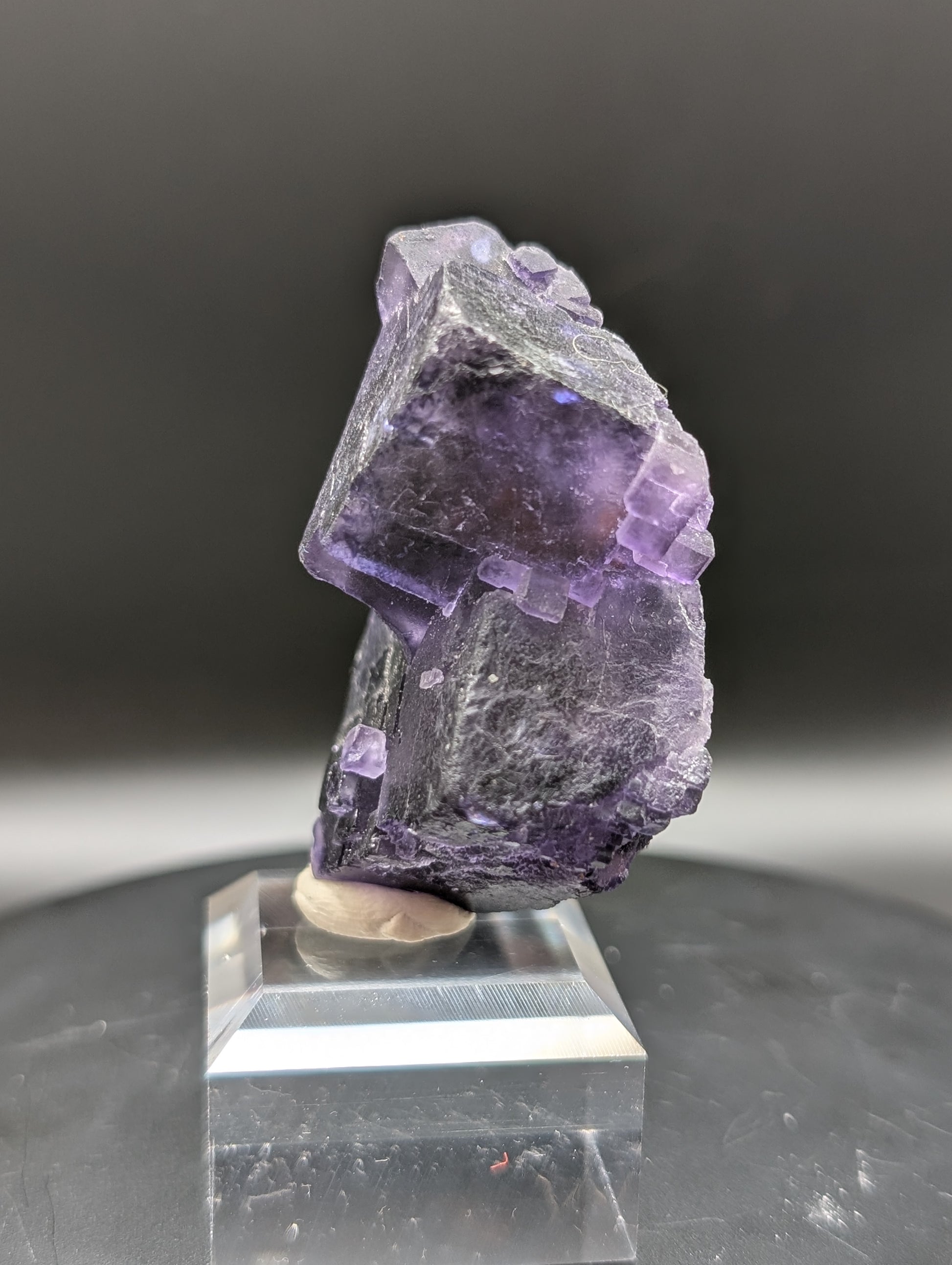 striking purple fluorite hopper crystal specimen featuring stepped cubic growth and beautiful internal zoning. This cabinet-size piece displays classic fluorite cube formation with smaller secondary crystals growing along the edges.