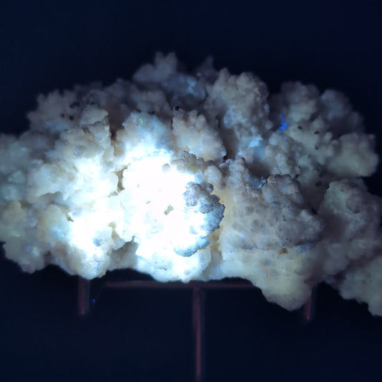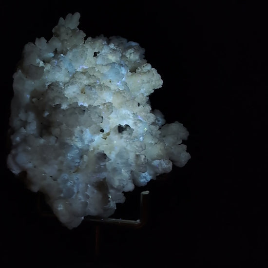 A unique natural calcite cluster featuring an incredible combination of UV fluorescence and phosphorescent afterglow.