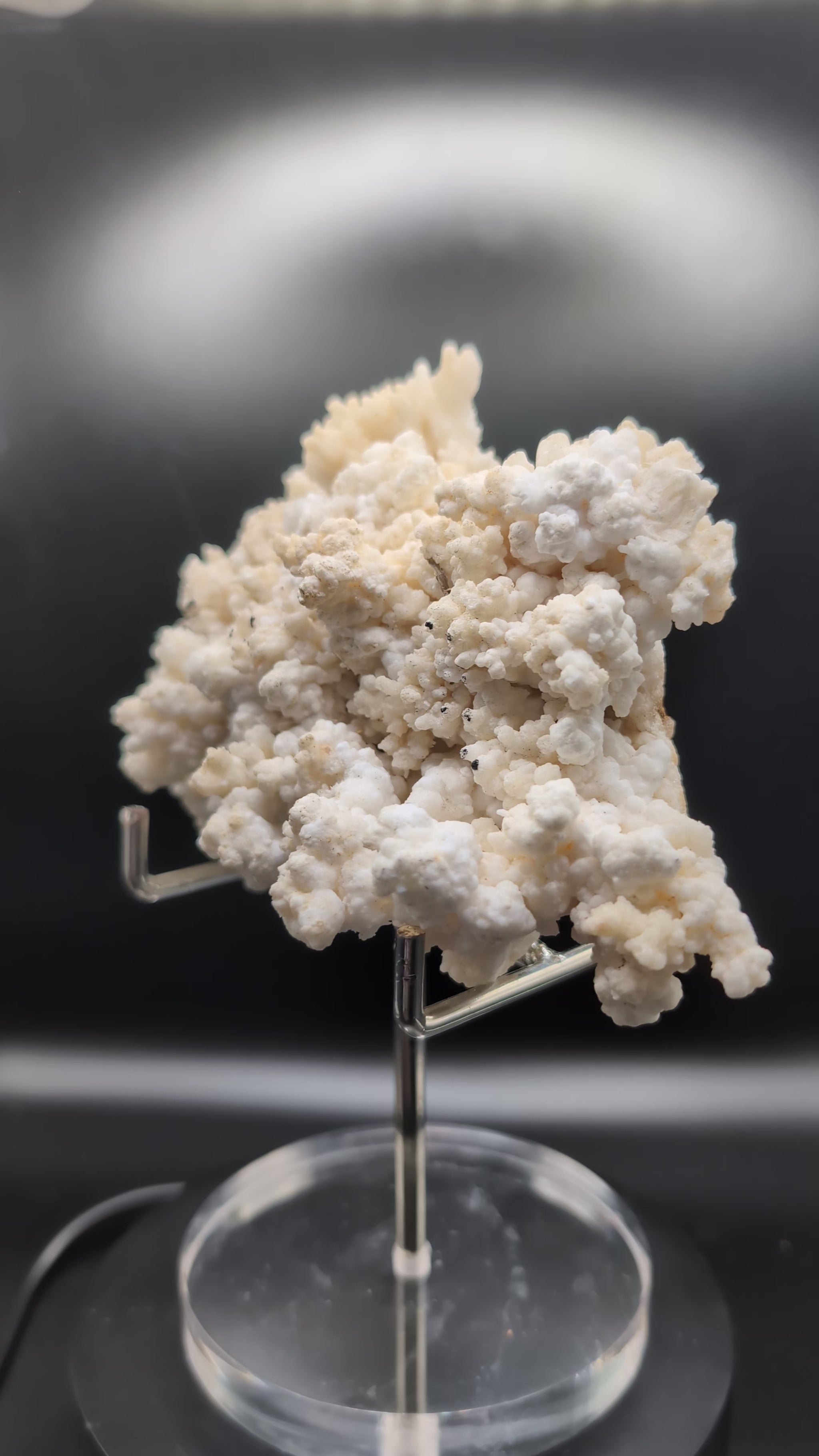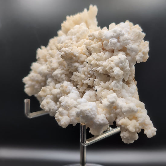 The surface is covered in intricate, botryoidal-style calcite formations, giving it a textured, almost coral-like appearance, contrasted by a natural matrix base.